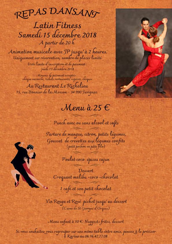 Rendez-vous Samedi 15 Décembre au Restaurant le Richelieu : 15 Rue Bonnier de la Mosson, 34990 Juvignac pour un repas + une soirée dansante à partir de 20h et jusqu'à 2h du matin.